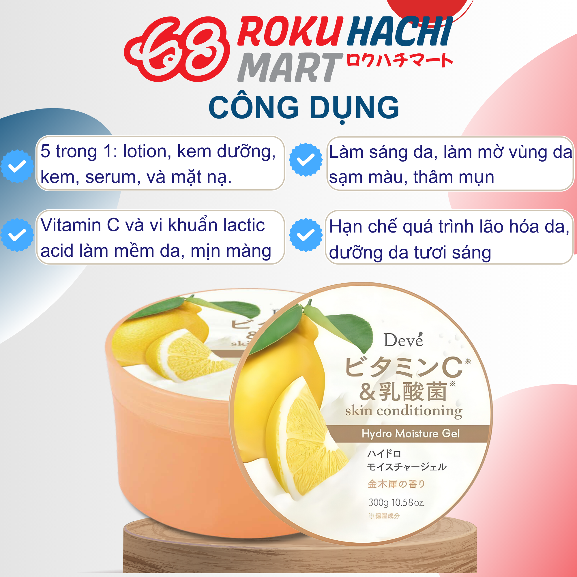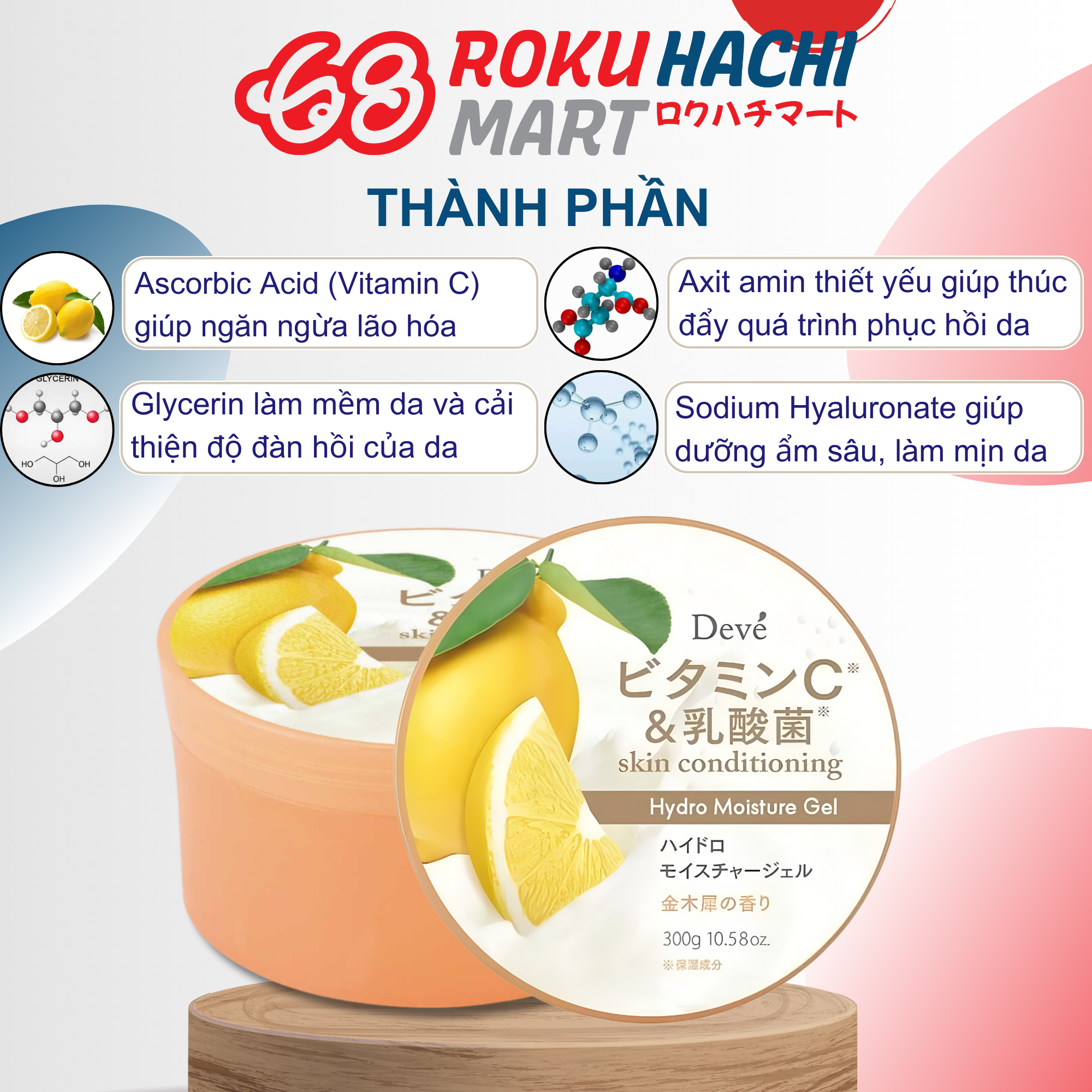 Gel Dưỡng ẩm Deve 5in1 Chiết Xuất Chanh Tươi - Deve Vitamin C & Lactic Acid Hydro Moisture Gel (300g) ディブ ビタミンC&乳酸菌HモイスチャーG300G