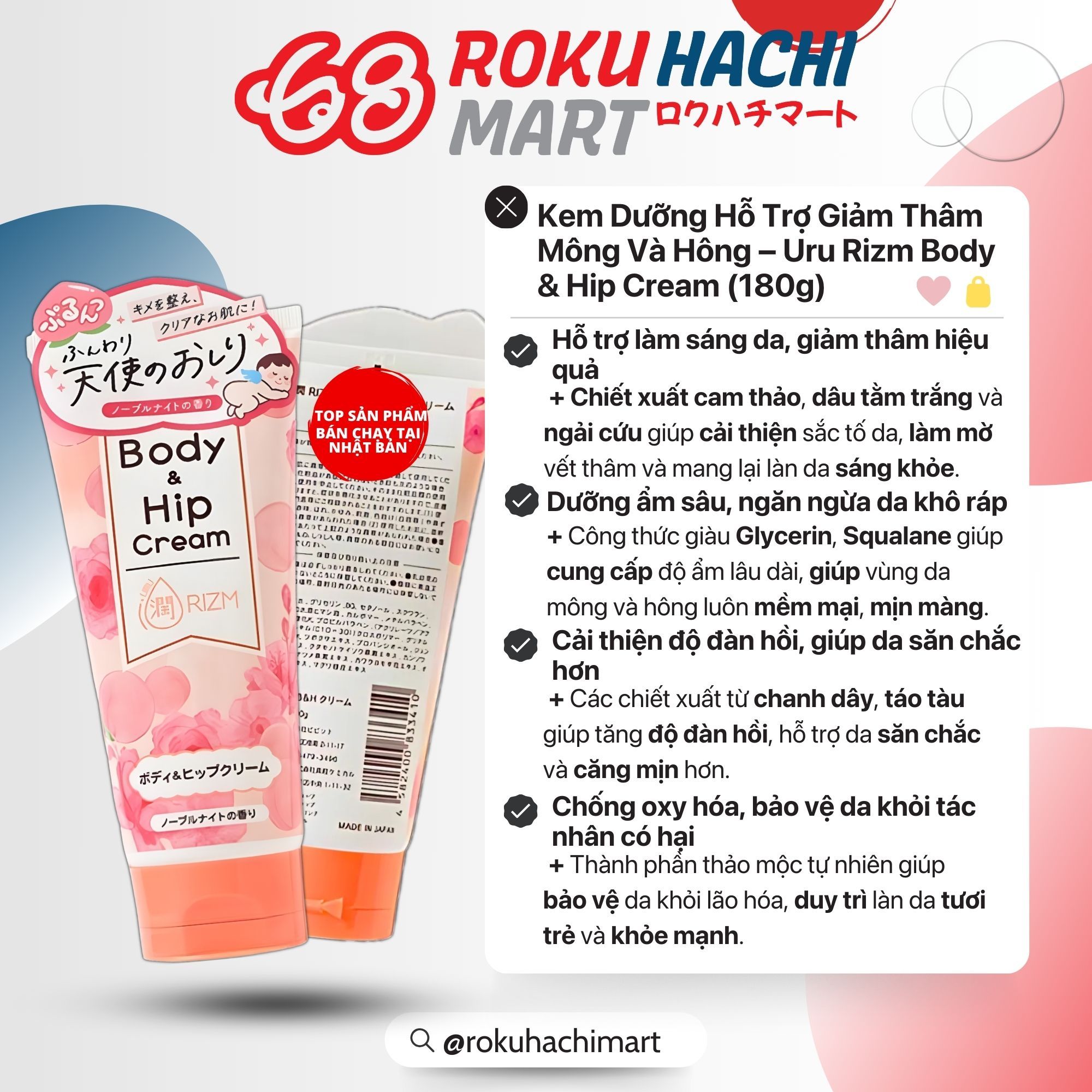 Kem Dưỡng Hỗ Trợ Giảm Thâm Mông Và Hông - Uru Rizm Body & Hip Cream (180g) 潤RIZMボディ&ヒップクリーム 60G