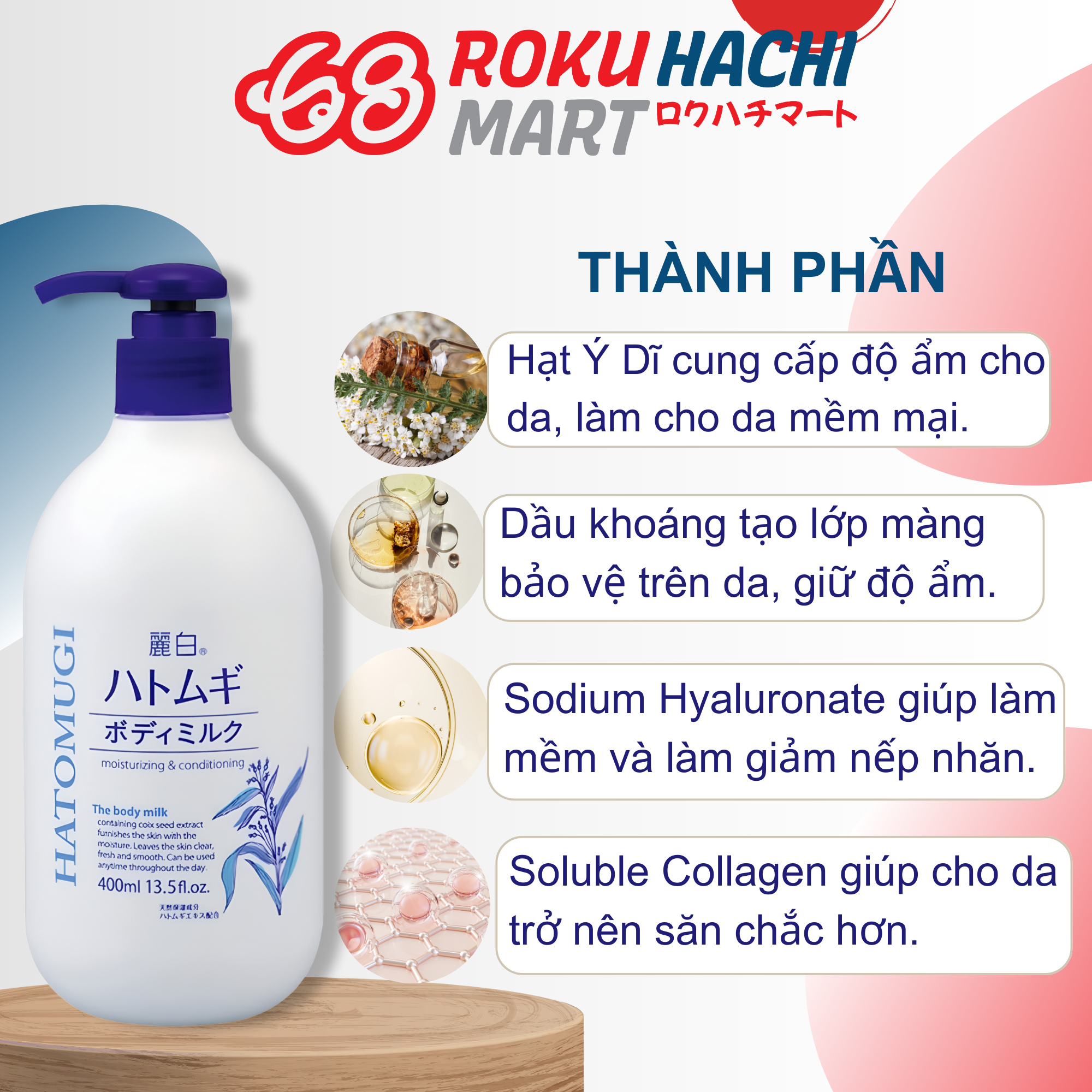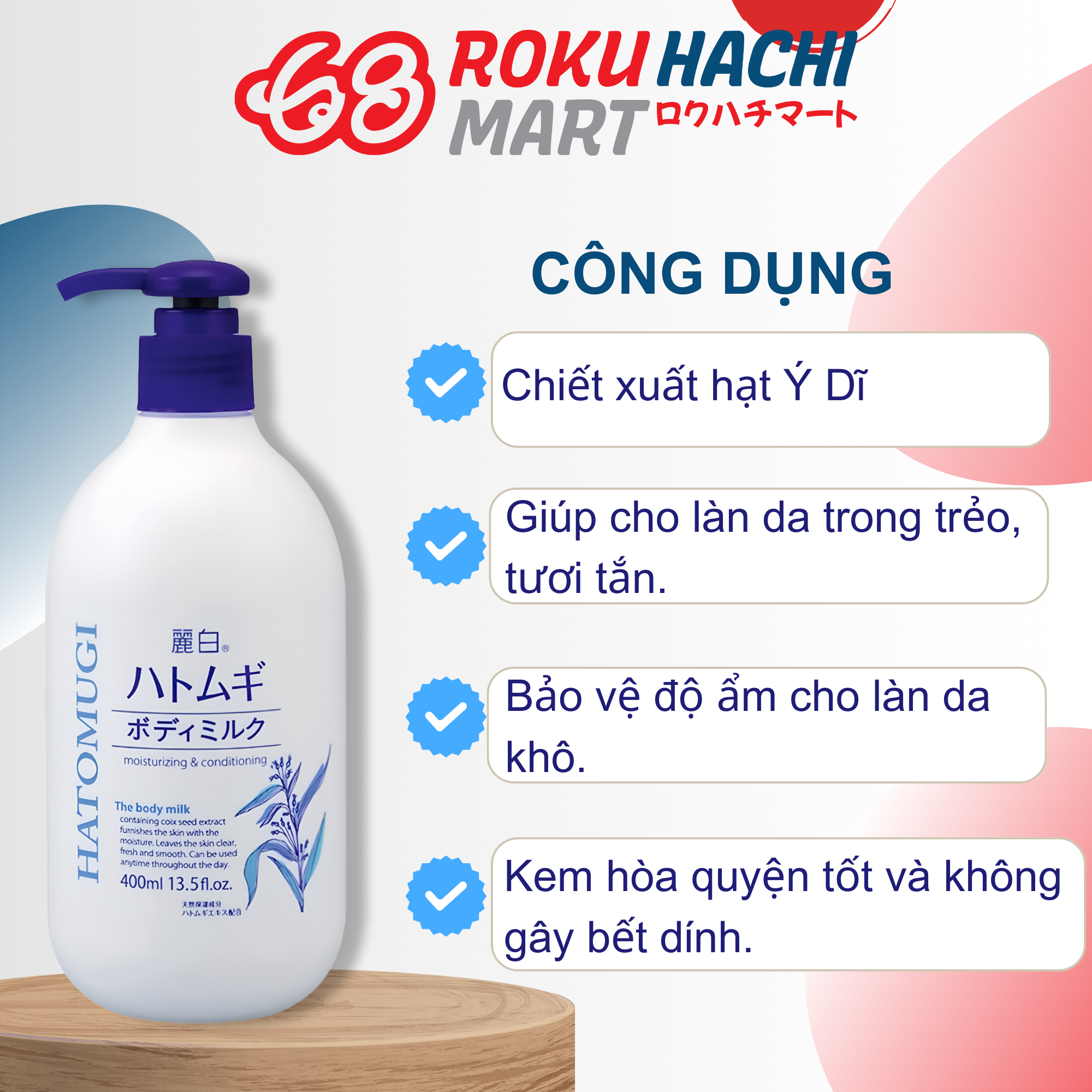 Sữa Dưỡng Thể Hatomugi Dưỡng Ẩm Ban Đêm - Hatomugi The Body Milk (400ml) 麗白 ハトムギボディミルク400ML