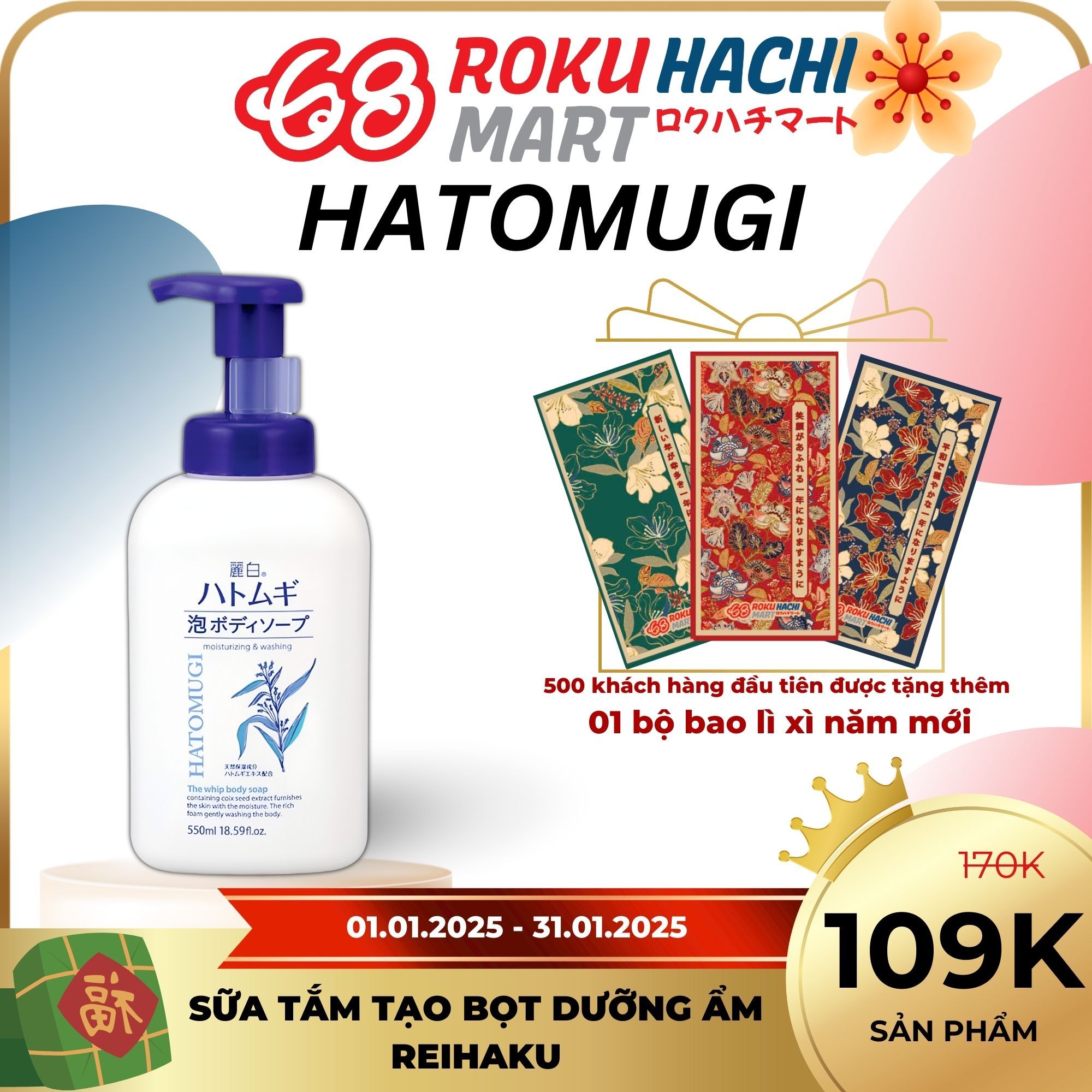 Sữa Tắm Tạo Bọt Dưỡng Trắng Da - Hatomugi The Whip Body Soap (550ml) 麗白 ハトムギ 泡ボディソープ 本体550ML